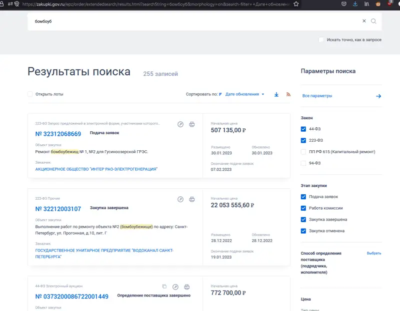На данный момент на сайте российской системы госзакупок размещено 255 записей о ремонтах в бомбоубежищах по всей стране. Тендеры включают ремонт вентиляции, гидроизоляцию, замену дверей, установку воздушного фильтра и освещения.